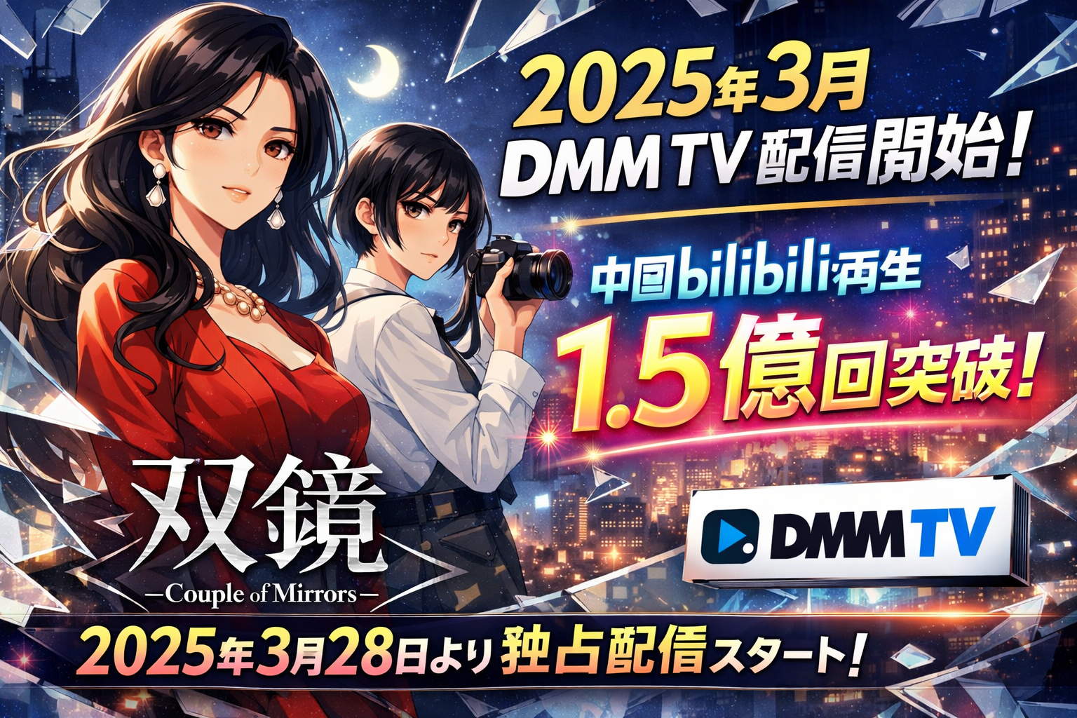 中国発のシスターフッド・サスペンスドラマ『双鏡 -Couple of Mirrors-』は、DMM TVにて2025年3月28日より見放題配信中です。中国のbilibili動画で総再生回数1.5億回超えを記録した話題作が、ついに日本上陸を果たしました。