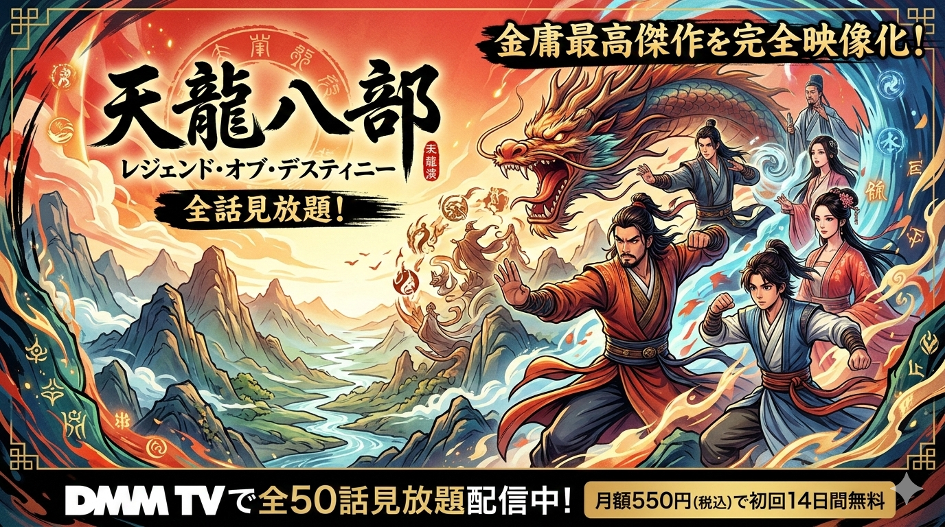 金庸の最高傑作と名高い武侠小説「天龍八部」を完全映像化した中国ドラマ「天龍八部 レジェンド・オブ・デスティニー」は、DMM TVで全50話が見放題配信中です。月額550円(税込)で、しかも初回14日間は無料で視聴できます。壮大な歴史アクションの世界を、ぜひお得に楽しんでください。