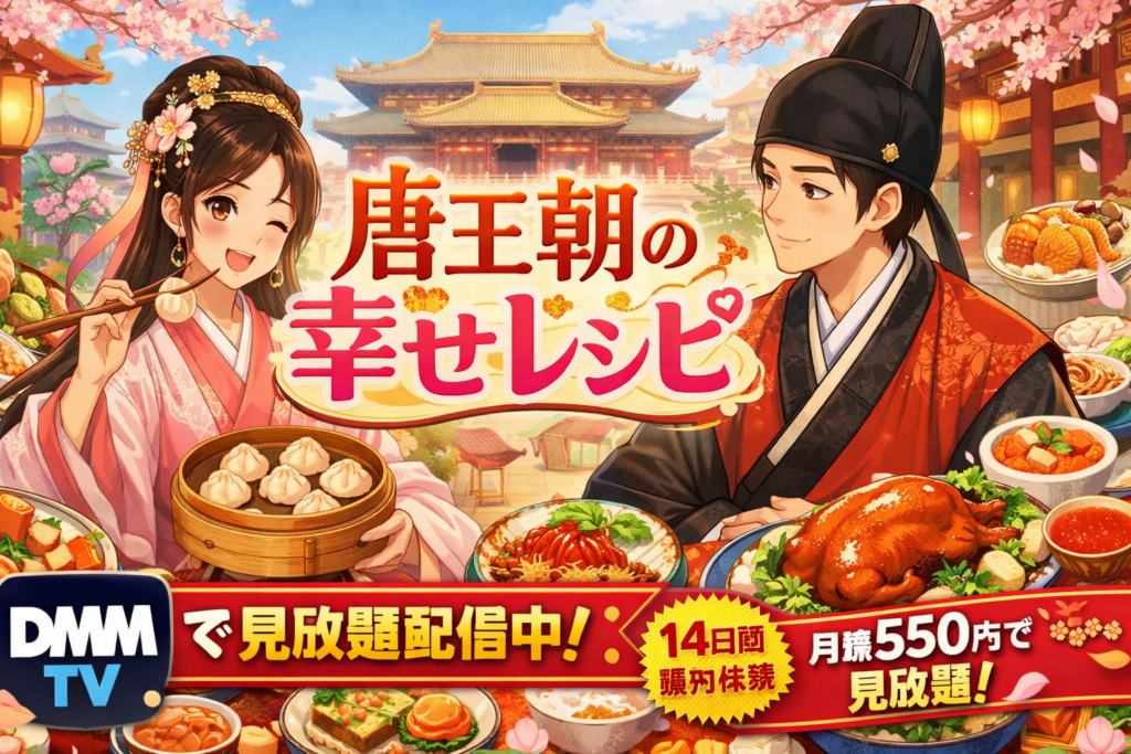 「唐王朝の幸せレシピ」はDMM TVで日本語字幕版・全8話が見放題配信中。月額550円のDMMプレミアム会員なら追加料金なし、初回14日間無料体験で実質0円。あらすじ・見どころ・口コミ・視聴方法をまとめました。